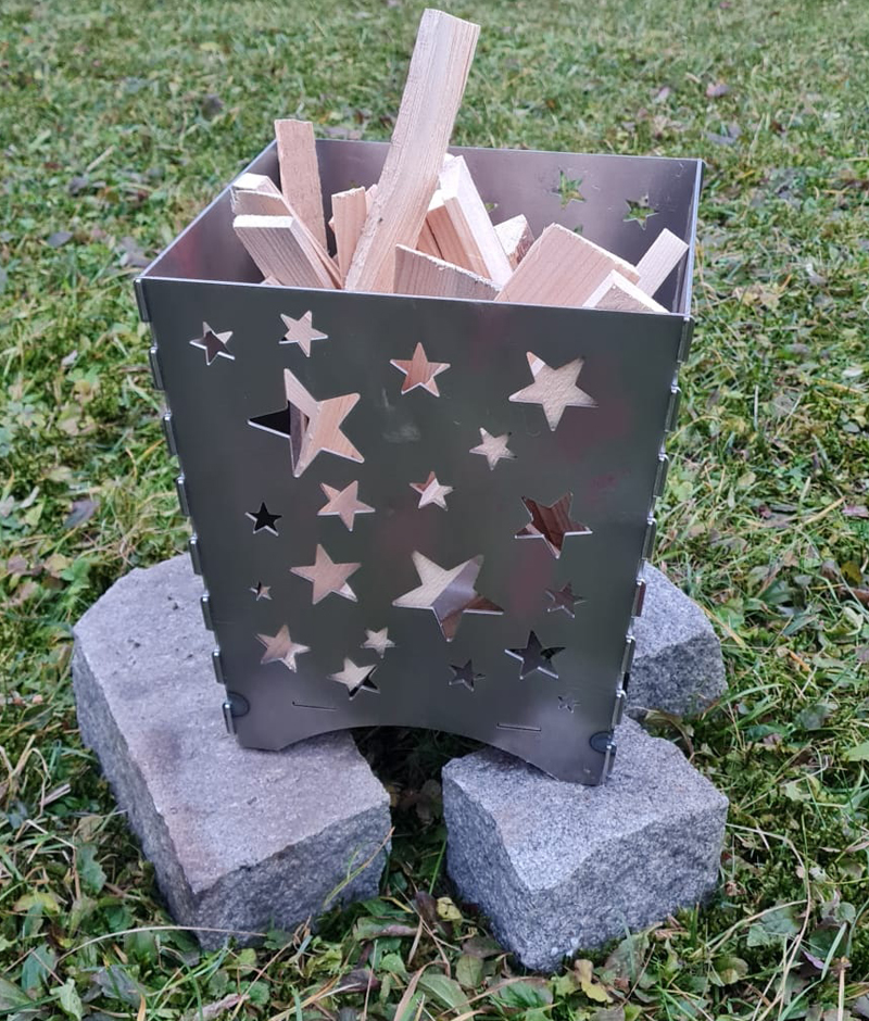 Die ausgestanzten Sterne in verschiedenen Größen sorgen dafür, dass das Feuer von innen heraus leuchtet und ein warmes, lebendiges Muster in der Umgebung erzeugt. Der Feuerkorb wirkt sowohl tagsüber dekorativ als auch abends atmosphärisch.