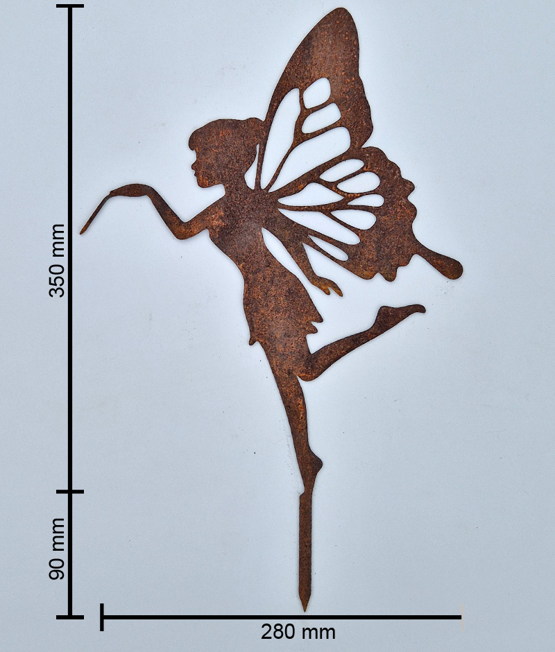 Da Cortenstahl Rostspuren abgeben kann, fühlt sich die Fee besonders wohl auf Naturflächen wie Erde, Kies oder Rasen. Dort fügt sie sich harmonisch in die Umgebung ein und schafft eine stimmungsvolle Verbindung zwischen Metall und Natur.